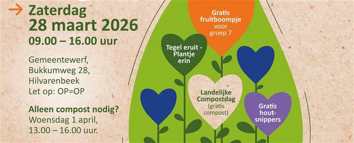 Kom op zaterdag 28 maart 2026 van 9.00 tot 16.00 uur tijdens de Samen Groener Dag naar de gemeentewerf aan de Bukkumweg 28 in Hilvarenbeek. Let op: op = op.